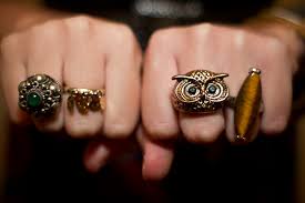 Perceba que nas fotos abaixo, os anéis "combinam" entre si, ou seja, ou possuem o mesmo tema, ou a mesma cor/tom, o que raramente acontece, mas que eu inclusive, adoro, é misturar o prata com o dourado, mas o que vale é o bom senso e não há uma cartilha a seguir (e mesmo se tivesse, ninguém seria obrigada a usar, certo?)